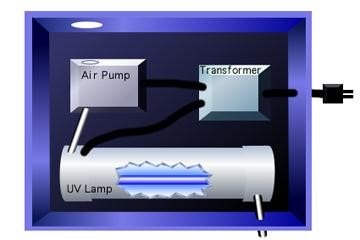 در این روش نور فرابنفش (در ناحیه 254 نانو متر) را به لوله شیشهای از جنس کوراتز میتابانند تا گاز عبوری در لوله را تحت تاثیر قرار دهد. به دلیل بازدهی کم این روش، معمولا به جای هوا از گاز اکسیژن خالص استفاده میکنند ( شکل 1).