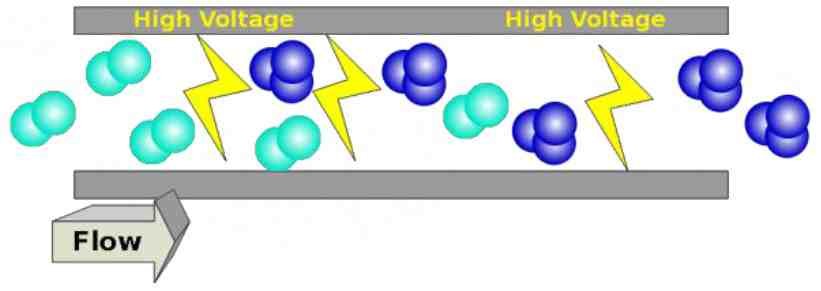 روش تخلیه الکتریکی که به اصطلاح به آن کرونا[12] گویند، روشی است که ولتاژ بسیار بالایی در میان شکافِ دو الکترود به وجود میآید. زمانی که در میان این شکاف، گاز اکسیژن وجود داشته باشد، این انرژی انتقال ولتاژ بالا منجربه یونیزه شدن مولکولهای اکسیژن شده و درنتیجه این فرایند مولکولهای ازون تشکیل میشود (شکل 2).