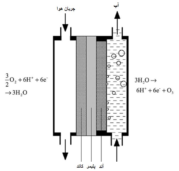 شکل 5 : سلول غشای الکترولیت پلیمری تولید کننده ازون که کاتد در تماس با اکسیژن گازی میباشد [5].