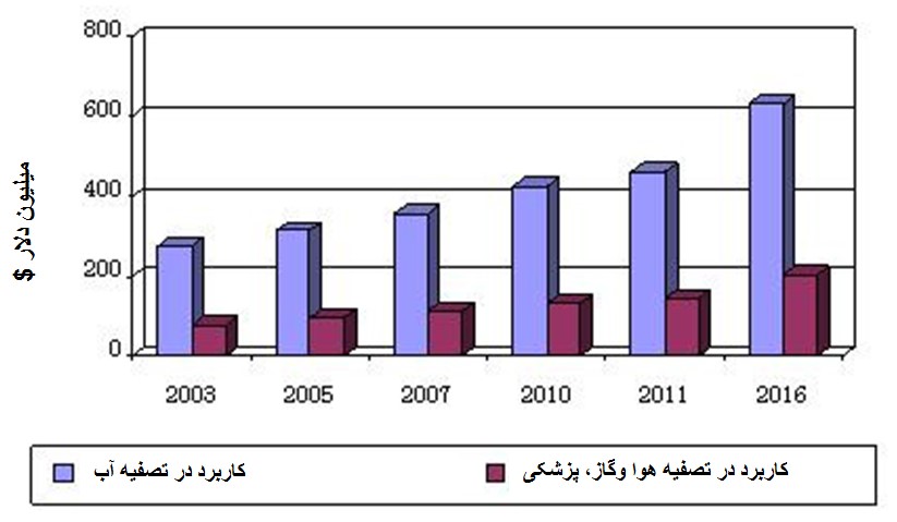 بنا بر پیش بینی موسسه bccresearch، بازار جهانی فناوری ازون از 606 میلیون دلار در سال 2011 با رشد 7/6 درصدی به 838 میلیون دلار در سال 2016 خواهد رسید [10]. از این میزان، سهم بازار تولید ازون جهت تصفیه آب 5/465 میلیون دلار در سال 2011 بوده که با رشد 7 درصدی به 643 میلیون دلار در سال 2016 خواد رسید (شکل 9). همچنین موسسه Persistence Market Research پیش بینی میکند که با توجه به رشد آلودگیهای محیط زیستی و کاهش منابع آب، نیاز به فناوری تولید ازون نسبت به روشهای گندزدایی کلر زنی و تابش برتو UV بیشتر خواهد شد. بنابر پیش بینی این موسسه، بازار فناوری ازون بین سالهای 2014 تا 2020 رشد 1/8 درصدی را خواهد داشت و بازار کلی فناوری ازون در تصفیه آب، پزشکی و صنعت معادل 1242 میلیون دلار در سال 2020 خواهد بود [11].