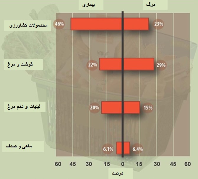 شکل1 : محصولات غذایی مختلف که بین سال 1998 تا 2008 به عنوان منبع مسمومیت غذایی ناشی از آلودگی میکروبی شناخته شدهاند [2].