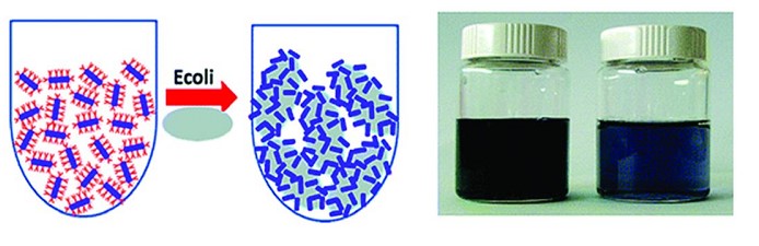 شکل 3 : تغییر رنگ محلول محتوی نانوذرات در حضور باکتری EColi [4].