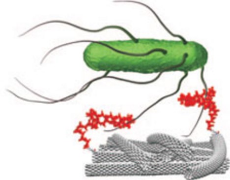 شکل 4: اتصال گزینش پذیر باکتری روی سطح نانو لوله کربنی در یک نانوحسگر [5].