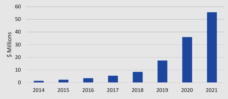 شکل 5: رشد بازار نانو حسگرهای تشخیص دهنده پاتوژنهای مضر در صنعت غذایی بر حسب میلیون دلار ] 6 [.