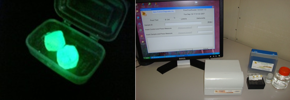 شرکت Nanoscience Diagnostics، نانو حسگرهایی جهت تشخیص باکتری، ویروس و پروتئین در مواد غذایی را به مرحله تولید رسانده است. محصولات این شرکت به صورت کیت تشخیصی عرضه میشود که دارای مراحل استخراج میکروب از مواد غذایی، اتصال نانو ذرات به میکروب و شناسایی و اندازهگیری مقادیر میکروب میباشد. این کیت بسیار حساس بوده و در کمتر از 15 دقیقه به جواب میرسد (شکل 10) [13].