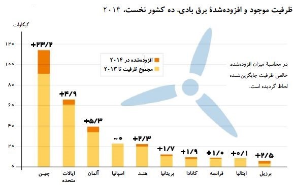 ده کشور نخست در زمینه تولید برق با استفاده از انرژی بادی در شکل 3 تا سال 2014 نمایش دادهشدهاند.
