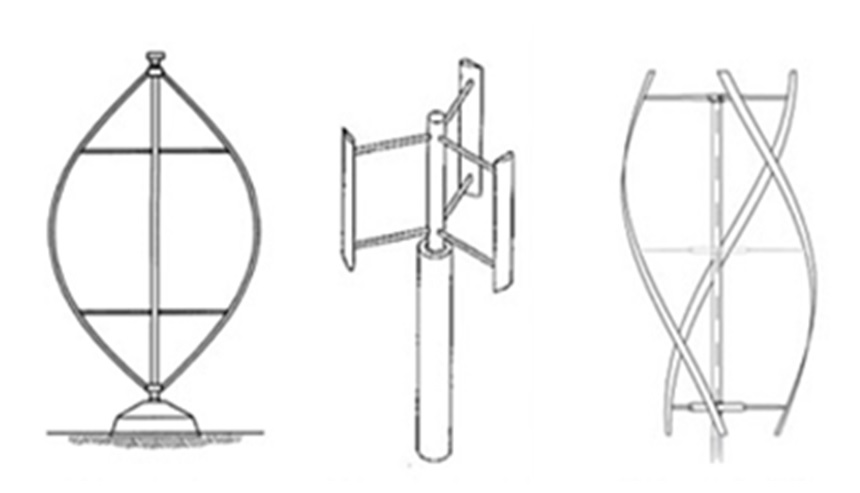 توربینهای بادی با محور عمودی به شکلهای مختلفی ساخته میشوند. دو نوع عمده آنها، توربینهای داریوس و ساوونیوس هستند. توربینهای داریوس و ساوونیوس بهصورت شماتیک به ترتیب در شکلهای 5 و 6 نشان دادهشدهاند[7].