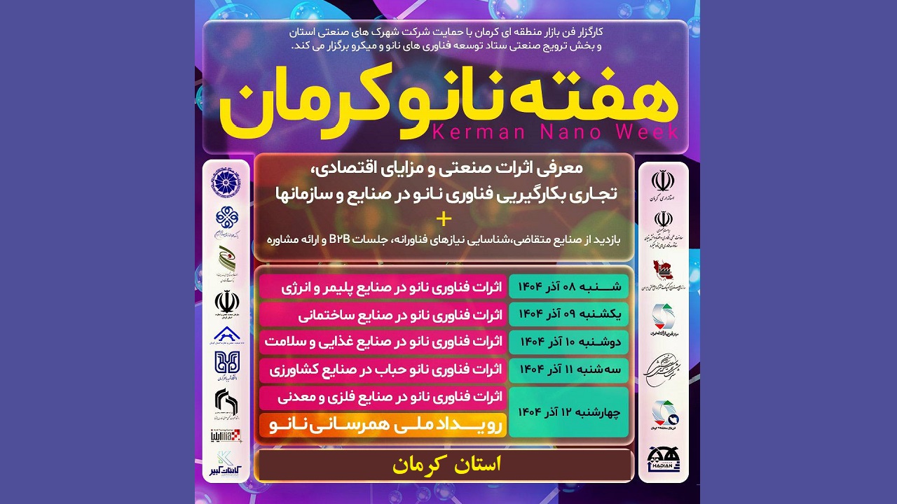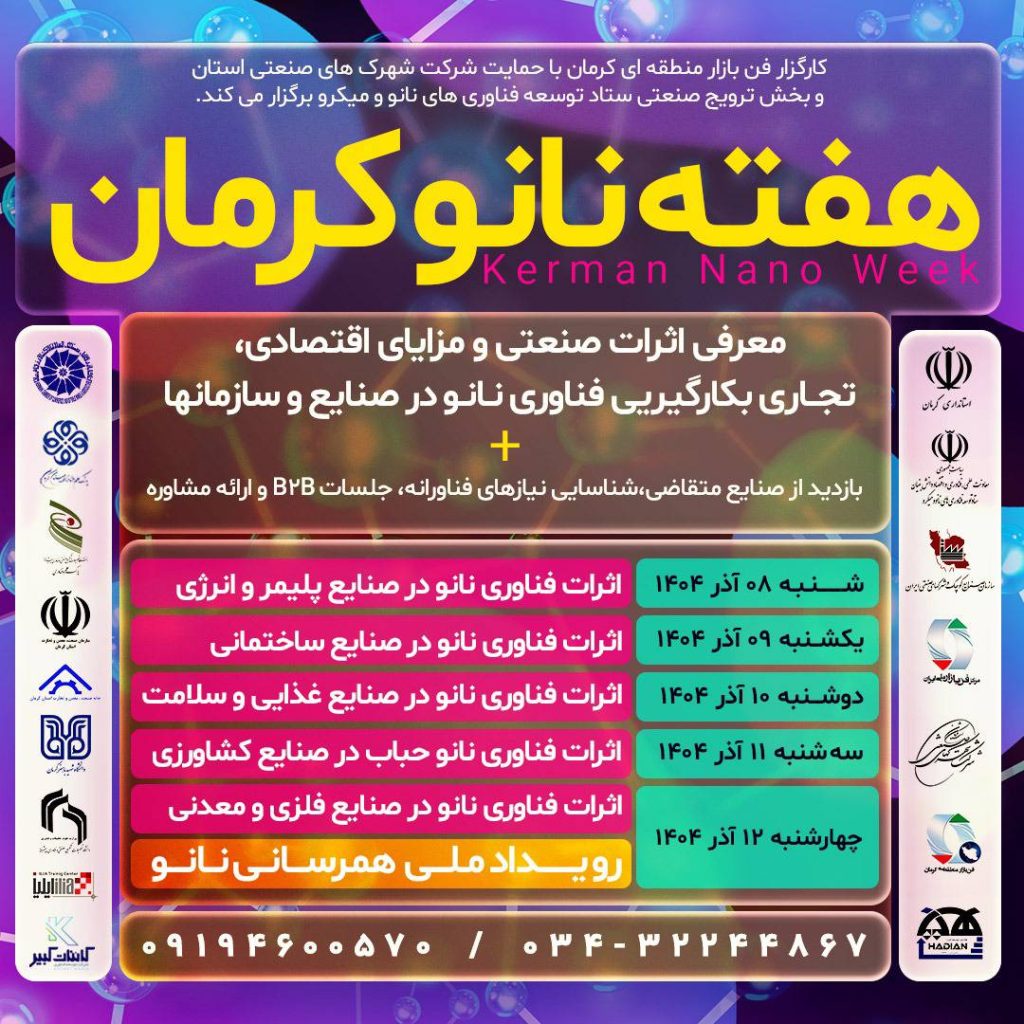در راستای توسعه و ترویج صنعتی فناوری نانو، رویداد «هفته نانو کرمان» با هدف معرفی اثرات صنعتی و مزایای اقتصادی، تجاری فناوری نانو و با شعار “تحول در مقیاس نانو، جهش در مقیاس صنعت” از ۸ تا ۱۲ آذرماه 1404 در استان کرمان برگزار می‌شود.