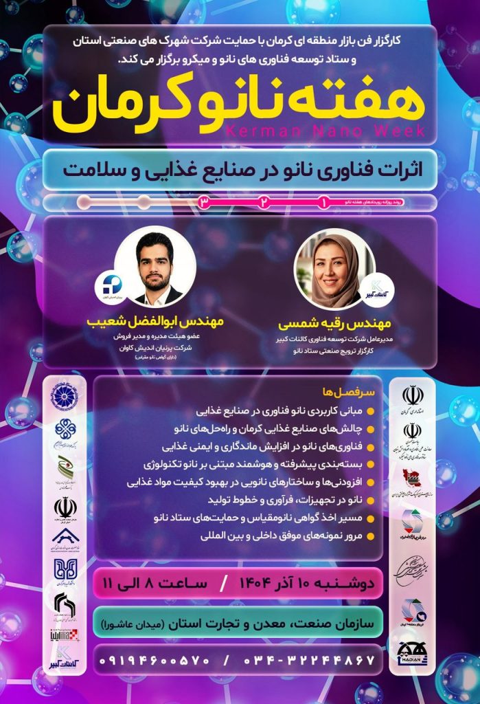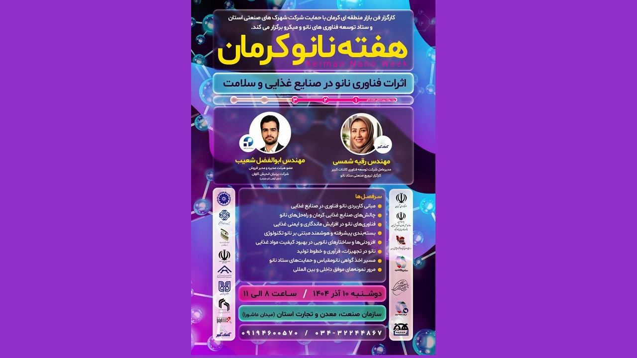 سومین روز از «هفته نانو استان کرمان» با عنوان «اثرات فناوری نانو در صنایع غذایی» در دهم آذرماه سال جاری، در محل اداره کل صنعت، معدن و تجارت این استان برگزار شد.