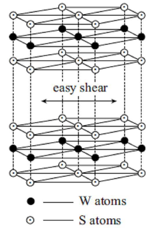 نانو افزودنی IF-WS2[9] را به عنوان روانکار جامد نه تنها در شرایط متعارف بلکه تحت شرایط دشوار، مانند دما و فشار بالا، بار زیاد، خلأ زیاد، تابش و محیط خورنده میتوان به کار برد. این نانو افزودنی دارای ساختار لایهای بسته شش ضلعی است که در شکل 1 نشان داده شده است. هر اتم تنگستن به دواتم سولفور متصل است. اتم تنگستن و سولفور با پیوندهای قوی شیمیایی به یکدیگر متصل شدهاند در حالی که اتمهای سولفور با پیوند ضعیف مولکولی به یکدیگر اتصال دارند. نانو افزودنی WS2 یک ترکیب شیمیایی بیاثر است که به سختی در محیطهایی مثل آب، روغن، الکل و اسید حل میشود ولی به گاز فلوئور، سولفوریک اسید داغ و فلوئوریدریک اسید حساس است. این ترکیب غیر سمی بوده و موجب زنگزدگی و خوردگی فلزات نمیشود. همچنین دارای مقاومت حرارتی بالایی بوده و نسبت به اکسید شدن مقاوم است [4].
