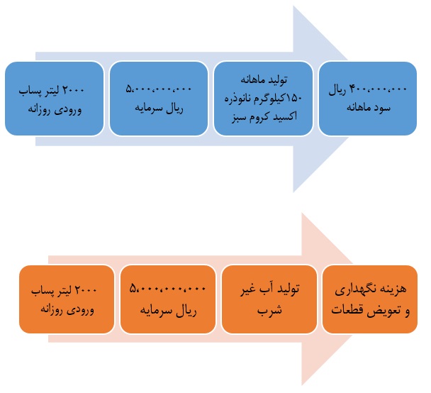 شکل 3- مقایسه مالی روش تولید نانوذره اکسید کروم سبز از پساب آبکاری کروم (بالا) و روش فیلتراسیون (پایین).