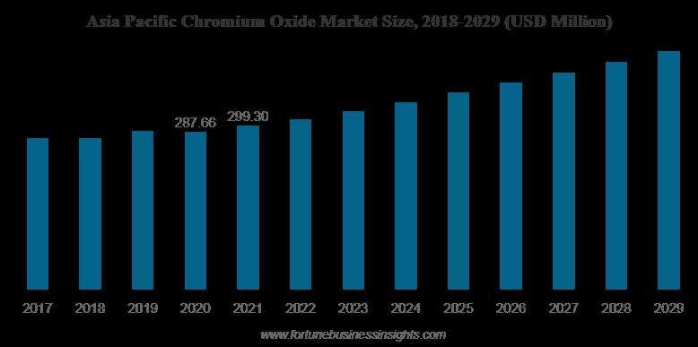 اندازه بازار جهانی اکسید کروم در سال 2021 مقدار 526.8 میلیون دلار بود و پیشبینی میشود تا سال 2029 به 740.3 میلیون دلار برسد، که نرخ رشد ترکیبی سالیانه (CAGR) 5/4% در دوره پیشبینی نشان میدهد. انتظار میرود اندازه بازار اکسید کروم در طول بازه زمانی پیشبینیشده بهطور پیوسته رشد کند. آسیا و اقیانوسیه بر سهم بازار اکسید کروم در سال 2021 تسلط داشته و انتظار میرود در طول دوره پیشبینی، به دلیل گسترش صنایع فلزی و ساختمانی در کشورهایی مانند چین و هند، بیشترین سهم در این موقعیت جغرافیایی باقی بماند. افزایش تقاضا به استفاده آن در رنگها، پوششها و متالورژی، همراه با تولید بالای خودرو باعث میشود که ارزش بازار را در منطقه آسیا و اقیانوسیه افزایش دهد. علاوه بر این، رشد صنعتی شدن و شهرنشینی که نیاز به پوششها را افزایش میدهد، باعث رشد بازار منطقهای نیز میشود. نمودار 1، فروش اکسید کروم در منطقه آسیا و اقیانوسیه در طی بازه سالهای 2029-2017 نشان میدهد.