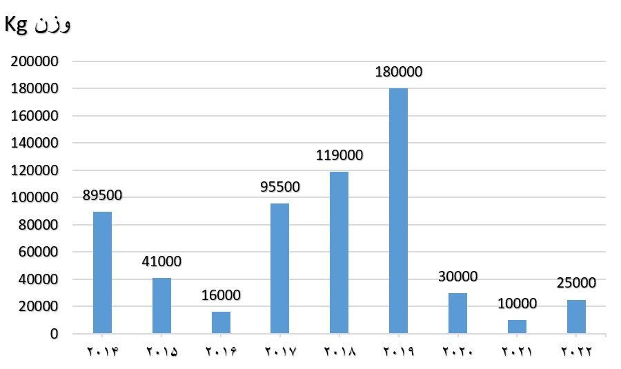 نمودار 3– آمار واردات اکسید کروم به ایران ثبت شده در سایت تجارت جهانی در سالهای 2014 تا 2022
