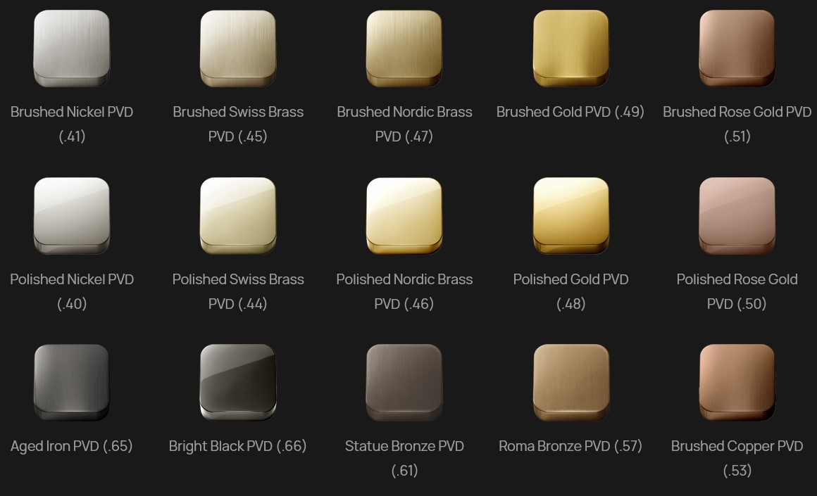 از رنگهای معمولی که با استفاده از PVD با رویکرد تزیینی اعمال میشوند، میتوان به رنگهای طلایی[8]، رز طلایی و برنز اشاره کرد. لیستی کامل از انواع این رنگها در تصویر آورده شده است.