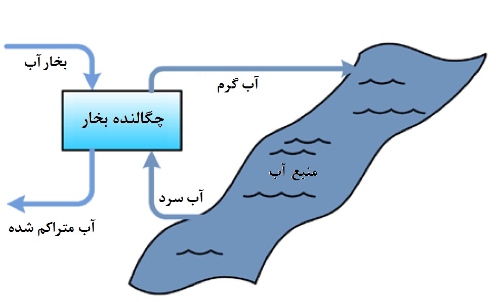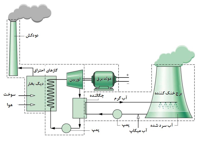 شکل 3. شماتیک کلی از چرخه آب در نیروگاه حرارتی برای تولید الکتریسیته [3].