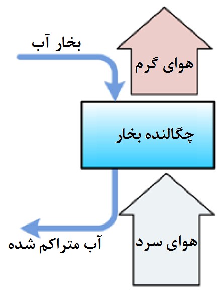 * تبخیر[14] که اساس خنک سازی در برجهای خنک کننده است و مقدار آب از دست رفته از طریق این فرایند کنترل نشده است. به ازای هر 10 درجه سانتیگراد کاهش دمای آب، یک درصد از آب در گردش به صورت بخار از دست می رود.