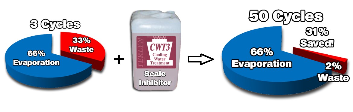 شاید بتوان بهترین و منحصر به فردترین محصول در حوزه بازدارندههای رسوب نوین را محصولی تحت عنوان CWT3 [25] دانست که توسط شرکت آمریکایی TERLYN به بازار عرضه میشود و قادر است با افزایش تعداد چرخههای غلظت به عدد 50، میزان هدر رفت آب طی فرایند تخلیه در برج خنک کننده را تا 90 درصد کاهش دهد. استفاده از این نوع بازدارنده در یک برج خنک کننده 1000 تنی می تواند سالانه نزدیک به 6/7 میلیون گالن از میزان آب مصرفی بکاهد و موجب کاهش نزدیک به 68 هزار دلاری هزینهها در هر ماه شود.