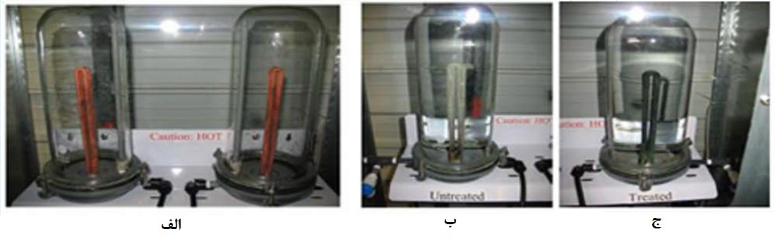 شکل14. بررسی عملکرد بازدارنده رسوب Nano_sorb gold در طی بازه زمانی 3 هفته؛ الف) روز اول و قبل از شروع آزمایش، ب) بعد از گذشت 3 هفته و عدم استفاده از بازدارنده بر روی عنصر گرم کننده رسوبات کلسیم ایجاد شده است، ج) بعد از گذشت 3 هفته و در حضور بازدارنده هیچ رسوبی ایجاد نشده است [15].