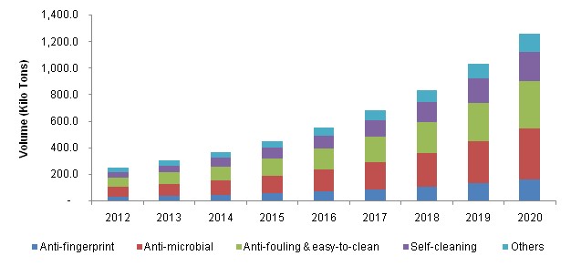 گزارشی توسط مرکز گرند[2] از بازار نانوپوششها از جمله پوششهای خودتمیز شونده منتشر شده است. در این گزارش به بررسی بازار پوششهای همچون ضد اثر انگشت، آنتی باکتریال، ضد خزه، راحت تمیز شونده و خود تمیز شونده در صنایع پزشکی، غذا، بسته بندی، دریایی، آب، الکترونیک، ساختمان، اتومبیل و انرژی تا سال 2020 پرداخته شده است. بازار نانوپوششها در سال 2012، 1495 میلیون دلار برای 225 کیلو تن از این پوششها بوده است. طبق شکل 1، بخش پوششهای خو تمیزشونده شامل هر دو نوع نانوپوششهای فوتوکاتالیستی و بیونیک است. همانگونه که درنمودار زیر مشاهده میشود تمامی انواع نانوپوششها از جمله پوششهای خود تمیزشونده در حال رشد میباشند [5].