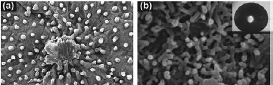 - ساختارهای مرتبه ای میکرو و نانو: برگ نیلوفر آبی در شکل 3 دارای ساختار مرتبه ای است. برگ این گیاه دارای شیارهایی با اندازه 100-3 میکرومتر است و ذراتی در اندازه 100 نانومتر در سرتاسر شیارها به صورت پراکنده قرار گرفته اند.