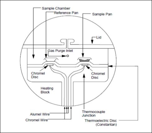 در تصویر شماتیک سلول دستگاه DSC نشان داده شده است. این دستگاه دارای دو حسگر مختلف برای اندازهگیری شار گرمایی است که زیر بوتههای نمونه و مرجع قرار میگیرند. در محفظه نمونه بسته شده و با بالا رفتن دما، جریان گرمایی اندازهگیری میشود.