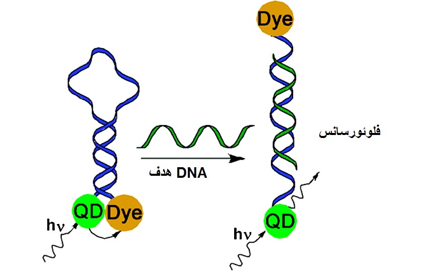 فوئورسانس پدیدهای است که باعث میشود برخی از اجسام، وقتی نور روی آنها میتابد، بدرخشند. رنگ نورِ تابانده شده به جسم با رنگ نوری که از جسم بازتاب میشود، همیشه تفاوت دارد. در بیشتر روشهای شناسایی، معمولا از مواد فوئورسانس کننده در تراشه[11]های تشخیصی ژنها و DNAها استفاده میشود. امروزه نقاط کوانتومی[12] به عنوان ماده فلوئورسانس کننده مورد توجه واقع شده است. نقاط کوانتومی، نانو بلورهایی از جنس مواد نیمه هادی هستند که اگر با یک منبع نور مانند لیز تحریک شوند، میدرخشند و یا نور فلوئورسنت از خود ساطع میکنند. نقاط کوانتومی حالت خاموش و روشن خواهند داشت و هنگام تشکیل توالی DNA هدف و یا اتصال توالی هدف به مکان مد نظر، میتوانند پاسخهای متفاوتی از فلوئورسنت را ایجاد نمایند. این قابلیت منجر به شناسایی سریع توالی مورد نظر خواهد شد (شکل 1).