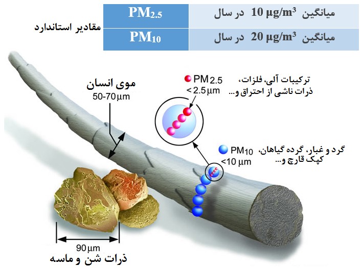 آلودگی ذرات معلق (PM) شامل تمام ترکیبات میکروسکوپی جامد یا مایع میشود که در اتمسفر زمین معلق هستند. طبقه بندی این نوع آلودگی عموما بر اساس اندازه ذرات صورت میپذیرد که مهمترین آنها عبارتند از PM10 که ذرات کوچکتر از 10 میکرومتر را در برمیگیرد، PM2.5 که ذرات کمتر از 5/2 میکرومتر را در برمیگیرد (شکل 1) و PM1 که ذرات کوچکتر از 1 میکرومتر را در برمیگیرد. در مجامع بینالمللی دو مورد اول (مخصوصا PM10) از اهمیت بیشتری برخوردار بوده و باتوجه به مضرات زیاد آنها بر روی سلامتی انسانها و دیگر موجودات زنده استانداردهایی برای پایش آنها وضع شده است که در شکل 1 قابل مشاهده است.