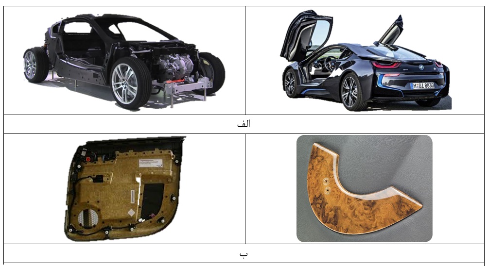 توسعه مواد سبکوزن یک هدف کلیدی برای صنعت خودرو میباشد. صنعت خودرو به سوی استفاده از مواد سبکوزن و محکم به منظور افزایش راندمان سوخت وسایل نقلیه حرکت میکند. به همین دلیل است که سازندگان اتومبیل به دنبال مواد و شیوههای جدیدی برای ایمن ساختن اتومبیل و در عین حال سبکتر کردن وزن آن میباشند [36]. به عنوان مثال، شرکت BMW یک بدنه کامل خودرو از جنس الیاف سبکوزن کربن، پلاستیک تقویتشده همراه با برخی قسمتهای داخلی ساختهشده از اجزاء چوبی توسعه داده است که در شکل 1- الف نشان داده شده است. مثال دیگر شرکت Volvo است که به منظور کاهش وزن پنلها، پنل داخلی درب را از کامپوزیت چوب/پلاستیک ساخته است که در شکل 1- ب نشان داده شده است. بر طبق برآورد CAFE [25]، کاهش 10 درصدی وزن یک خودرو میتواند مصرف سوخت آن را 8-6 درصد کاهش دهد [37].
