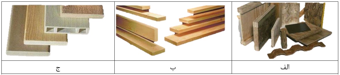 شکل 3- الف) محصولات چوبی مهندسیشده ، ب) الوار ، ج) کامپوزیتهای چوب-پلیمر