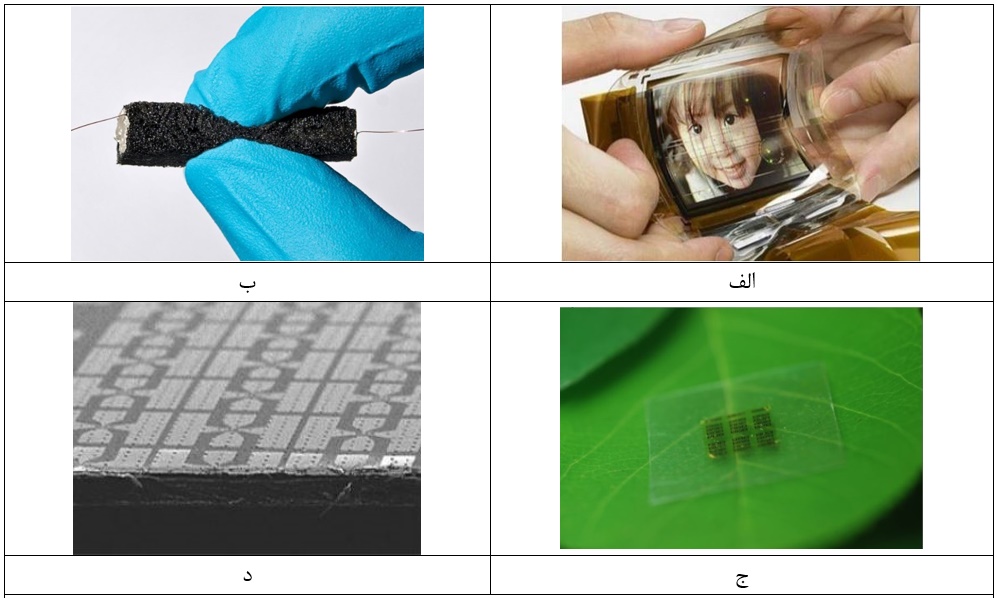 شکل 4- الف) صفحه نمایشگر انعطافپذیر، ب) باطری الاستیک و اسفنج مانند، ج) تراشه کامپیوتری ساخته شده از نانوفیبریل سلولز، د) ترانزیستور نانوسلولزی.