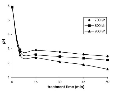 شکل 6- کاهش شدید میزان pH آب تحت فرآوری با پلاسمای قوسی خزنده در شارهای مختلف آب [4].