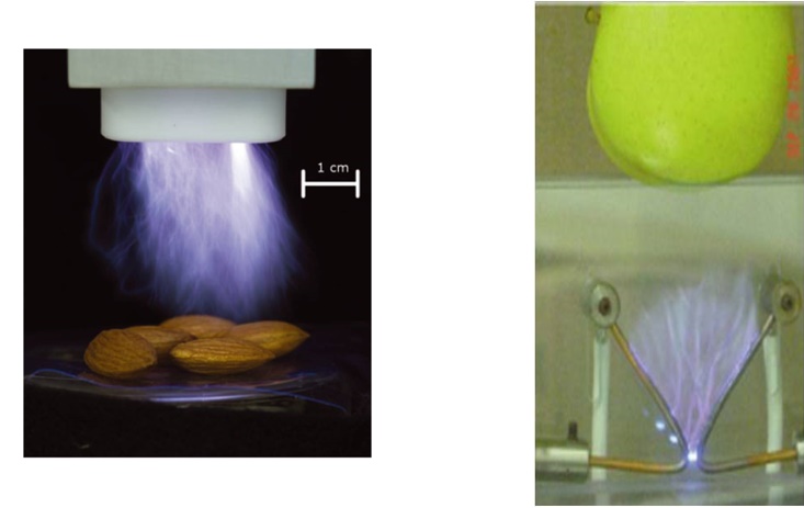 شکل 14- استفاده از پلاسمای قوسی خزنده برای میکروب زدایی سیب زرد[14] و بادام[15]
