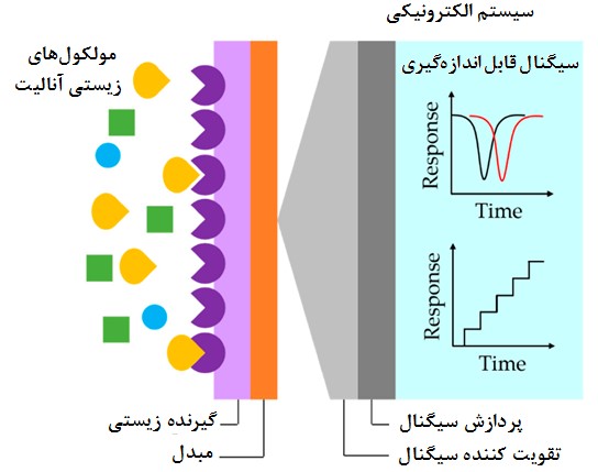 شکل ۱. طرح شماتیک از یک زیست‌حسگر نوعی و نحوه عملکرد آن [۵].