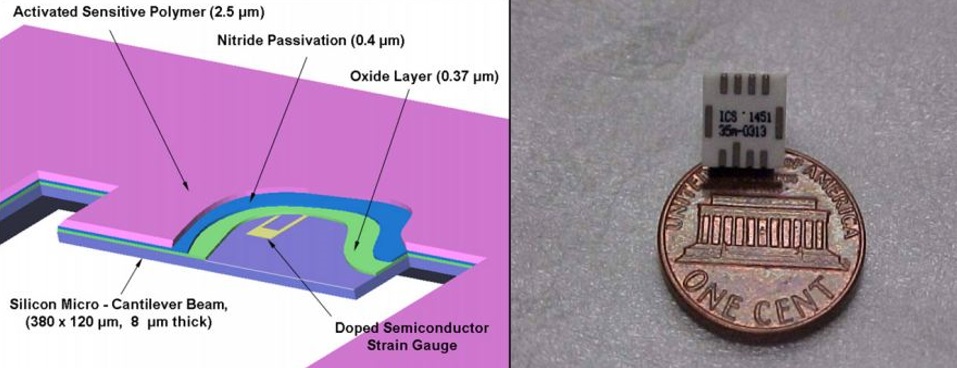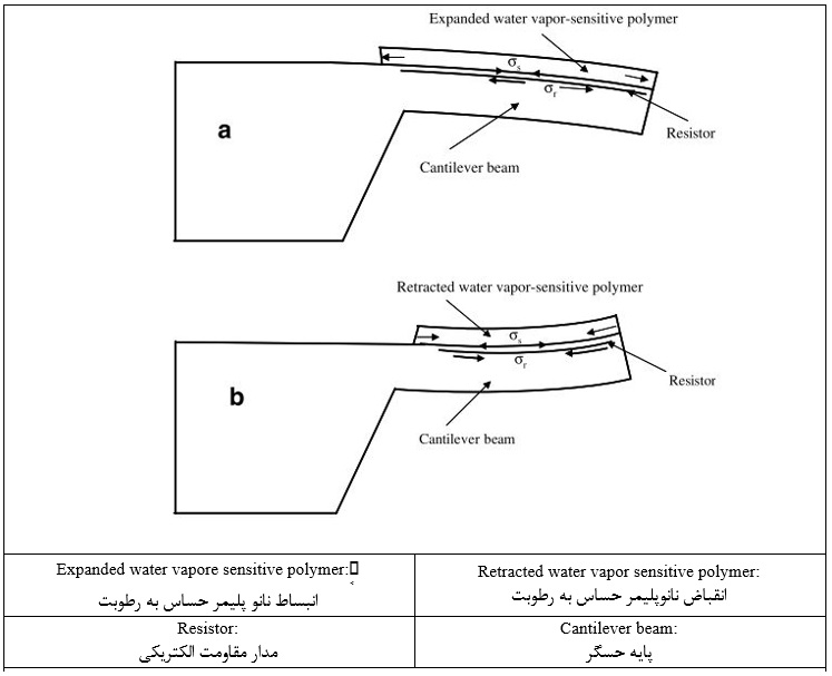 این انبساط و انقباضها تا زمان به تعادل رسیدن رطوبت خاک و نانوپلیمر ادامه مییابد. میزان انحناء ایجاد شده در پایه، بوسیلهی تغییر مقاومت تنش سنجهای قرار داده شده، اندازه گیری میشود. غلظت ملکولهای آب و تنش ایجاد شده در حسگر منجر به تغییر ولتاژ در مدار الکتریکی میگردد. میزان حساسیت نانوحسگر به عواملی چون ضخامت و استحکام پایه، طول پایه، میزان رطوبت، خصوصیت نانوپلیمر و میزان تنش برشی در سطح مشترک پایه و نانو پلیمر بستگی دارد. در بین این عوامل نیز، میزان حساسیت نانوپلیمر به کاربرده شده در حسگر و واکنش سریع آن به میزان رطوبت خاک بسیار مهم میباشد. از جمله نانوپلیمرهای به کار برده شده در سیستمهای میکروالکترومکانیکی میتوان به موادی چون [14]PEDOT-PSS، SU-8 و [15]PFSI اشاره کرد. مواد ذکر شده از حساسیت بسیار بالایی برخوردار هستند و قابلیت کاربرد در رطوبتهای بالا را دارند. همچنین نانو پلیمرها نسبت به پلیمرهای معمولی، دوام و پاپداری بیشتری داشته و قادرند خصوصیت انبساطی و انقباضی خود را برای مدت طولانیتری حفظ کنند.