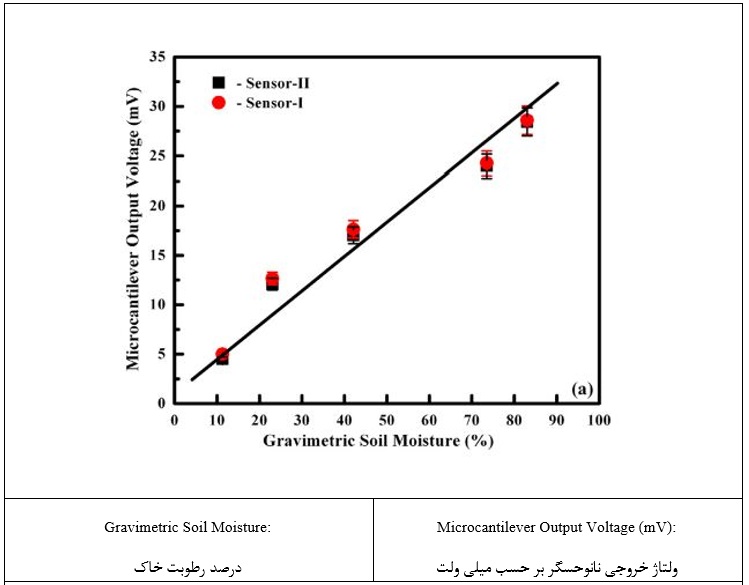 در تحقیقی، سه نمونه مختلف خاک شامل خاک بنتونیت، خاک رس سفید و خاک شنی تهیه شد و رطوبتهای مختلف به این نمونه خاکها اعمال گردید. نانوحسگرها در داخل هرکدام از این خاکها قرار گرفته و در فواصل زمانی مختلف، تغییر در ولتاژ خروجی حسگر با توجه به تغییر مقدار آب خاک ثبت شد. حداکثر میزان رطوبت در خاک بنتونییت 83%، خاک رس سفید 67% و خاک شنی 23% بود که میزان ولتاژ خروجی نانوحسگر برای هر کدام از خاکها، به ترتیب 28، 26 و 19 میلی ولت ثبت شد. در تکرارهای بعدی نیز همین اعداد بدست آمد. این نانوحسگرها توانستند تغییرات بسیار اندک و جزیی رطوبت خاک در حد 1/0 درصد را ثبت کرده و نشان دهند. همچنین به یک نمونه خاک بنتونیت، درصدهای مختلفی از رطوبت اعمال شده و در هر مرحله میزان رطوبت خاک با استفاده از دو نانوحسگر قرائت شد. نتایج نشان داد که نانوحسگرها اعداد یکسانی را در ولتاژ خروجی نشان میدهند و همچنین بین میزان رطوبت خاک و ولتاژ خروجی یک رابطهی خطی پدیدار گشت که نشان از دقت بالای نانوحسگر در تعیین میزان رطوبت خاک است (شکل 8).