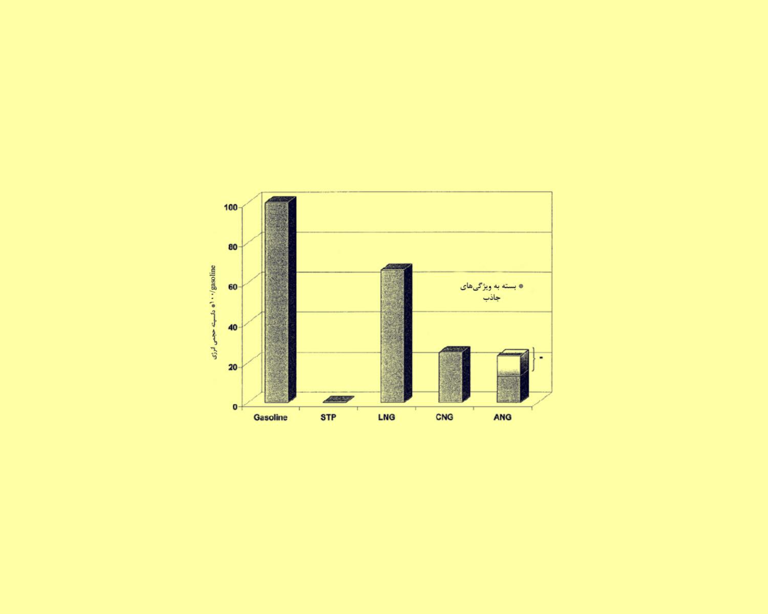 در شکل ۴ دانسیته انرژی بنزین، گاز طبیعی در شرایط استاندارد (دما 0°C و فشار 1bar)، LNG، CNG و ANG مقایسه شده است. با توجه به این شکل، بنزین و LNG بیشترین دانسیته انرژی را دارند و بسته به نوع جاذب غیرنانویی استفادهشده در ANG میتوان مقدار انرژی بالایی را حتی به اندازه CNG ذخیره کرد. با استفاده از نانوجاذبها ظرفیت ذخیرهسازی گاز به روش ANG بسیار بیشتر از CNG خواهد شد.