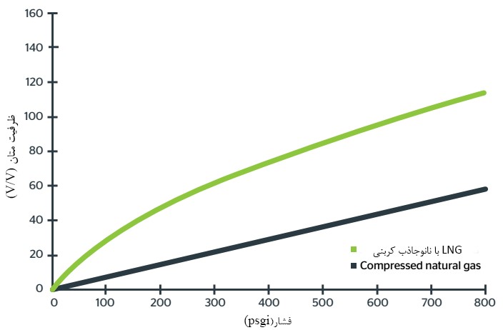 - ظرفیت بالغبر V/V۲۰۰ (حجم گاز ذخیرهشده در واحد حجم مخزن) برای ذخیرهسازی گاز طبیعی با استفاده از نانوجاذب وجود دارد.