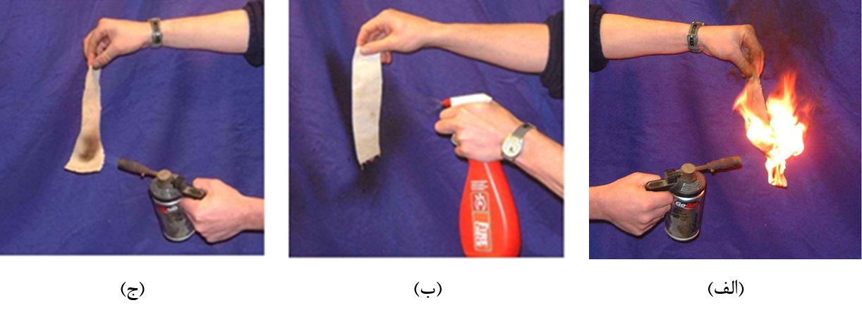 شکل 3. نمونه ای از پارچه کندسوز با استفاده از نانو مواد، (الف) آزمون اشتعال پارچه ساده، (ب) عمل آوری پارچه با نانو مواد و (ب) آزمون اشتعال پارچه تکمیلشده [3]