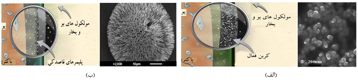 شکل 5. نانو مواد جاذب بوی نامطبوع در منسوجات (الف) نانوذرات کربن فعال و (ب) پلیمرهای قاصدکی