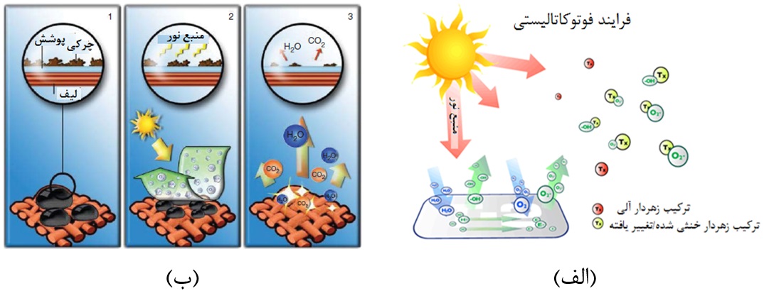 - نانو ذرات دیاکسید تیتانیوم باقابلیت فوتوکاتالیستی که از توانایی تجزیه لکهه ای آلی برخوردار هستند، روی سطح منسوج تثبیت میشوند. با استفاده از انرژی پرتو خورشید، دیاکسید تیتانیوم دو ماده واکنشدهنده اکسایشی رادیکالهای هیدروکسیل و آنیون سوپر اکسید ایجاد میکند. این دو ماده از طریق واکنش اکسایشی لکه آلی را تجزیه میکنند (شکل 7 الف). شکل 7 ب، طرحوارهای از فرایند حذف لکه آلاینده از روی منسوج را نشان میدهد.