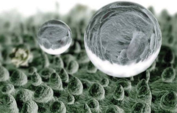 تکمیلهای دفعکننده آب و لکه های خشک و روغنی، در تمام بخشهای بازار نساجی از قبیل پوشاک، منسوجات خانگی و منسوجات صنعتی دارای اهمیت میباشند. با بهکارگيري فناوري نانو در عمليات توليد يا تکميل پارچه، قطرات مايع (اعم از آب، روغن) نميتوانند درون پارچههاي مقاوم در برابر مايعات، نفوذ کنند (شکل 9). اين اثر شبيه اثر موجود در برگهاي نیلوفر آبي يا گل لادن است که با یکلایه واکس به ضخامت يک نانومتر پوشيده شدهاند. این خاصیت با استفاده از انواع نانو ذرات از قبیل دیاکسید تیتانیوم، لایه سیلوکسان، نانولوله های کربن و غیره ایجاد میشود. در تمامی موارد، نفوذپذیری هوا در پارچه تکمیلشده نباید افت قابلتوجهی داشته باشد.