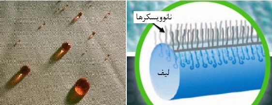 شکل 13. (تصویر سمت راست) قرارگیری نانوتاربلورها به طول 10نانومتر روی لیف، (تصویر سمت چپ) قطره شدن آبمیوه ریخته شده روی پارچه تکمیلشده با نانوویسکرها [16].