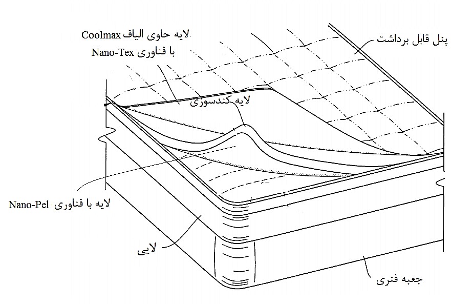 شركت سيمونز[6] (يكي از بزرگترین سازندگان وسايل خواب در جهان) آخرين نوآوري خود را بانام تشک هوشمند سلامت[7] عرضه كرده است (شکل 14). اين تشك داراي روكشي زیپداراست كه میتوان آن را جدا و خشکشویی كرد. در این روكش از الیاف توخالی بانام تجاريCoolmax® (الیاف پلیاستر با چهار کانال توخالی) محصول شركت دوپونت استفادهشده است. استفاده از اين الیاف به دلیل سرعت تبخیر زیاد رطوبت موجب عدم نگهداری رطوبت و تعریق در الیاف شده و پس از شسته شدن هم بهسرعت خشك میشود. استفاده از فناوری دافع آب شرکت نانوتکس در لایه دوم اين تشك مانع از نفوذ آبشده و درنتیجه، در صورت ریختن آب يا هرسيال ديگر بر روی تشک، امکان شستشو و پاک کردن سریع آن وجود دارد. لايه سوم نیز پارچهای حولهای است كه در آن از الياف تفلون باقابلیت حفاظتي فوقالعاده استفادهشده است.