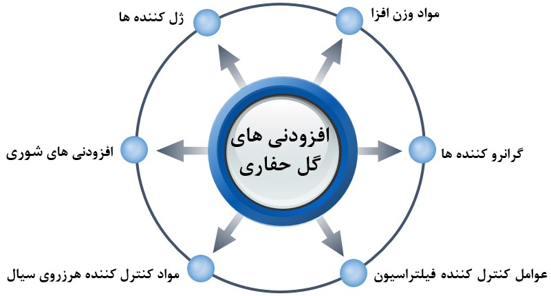 به طور کلی سیالات حفاری بر اساس سیال پایه تشکیل دهنده آن به سه دسته کلی گلهای پایه آبی[1]، گلهای پایه روغنی[2] و گلهای سنتزی[3] تقسیم بندی میشود. برای به دست آوردن یک سیال حفاری با خواص ویژه که کارایی بالایی داشته باشد، معمولاً افزودنیهایی به آن اضافه میکنند. طبق گزارشهای سایت World Oil بیش از 5000 نوع افزودنی مختلف به گل حفاری وجود دارد که از این میان میتوان به مواد پرکاربردی، همچون بنتونیت، باریت، خاک رس، سلولز، پلیمرها، آسفالت، کربنات کلسیم، پوست گردو و بسیاری مواد دیگر اشاره کرد. این افزودنیها وظایف ویژه ای دارند که در شکل 1 نشان داده شدهاند.