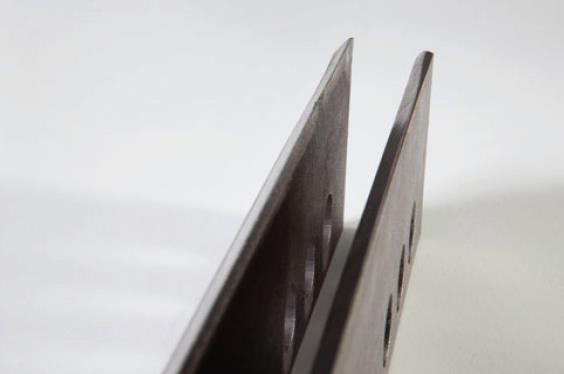 تصویر دو تیغه در کنارهم: تصویر سمت چپ متعلق به شرکت Kondex با پوشش حاوی نانوذرات کاربید تنگستن اعمال شده به روش پاشش حرارتی، و تیغه سمت راست مربوط به تیغه بدون پوشش با لبهی کند شده.