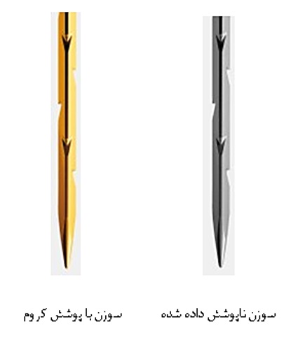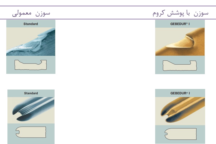 سوزن های معمولی، با پوشش کروم و با نانوپوشش پس از استفاده در مدت زمان مساوی به شکل زیر در آمده اند: