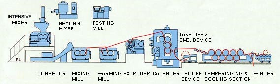 طرح کلی از خط تولید صفحات پلیمری با دستگاه کلندرینگ به عنوان جزء اصلی برای شکلدهی پلیمر