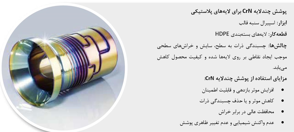 ابزار: اسپیرال سنبه قالب قطعهکار: لایههای بستهبندی HDPE چالشها: چسبندگی ذرات به سطح، سایش و خراشهای سطحی موجب ایجاد نقاطی بر روی لایهها شده و کیفیت محصول کاهش مییابد. مزایای استفاده از پوشش چندلایه CrN: · افزایش موثر بازدهی و قابلیت اطمینان · کاهش موثر و یا حذف چسبندگی ذرات · محافظت عالی در برابر خراش · عدم واکنش شیمیایی و عدم تغییر ظاهری پوشش