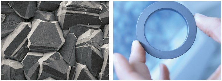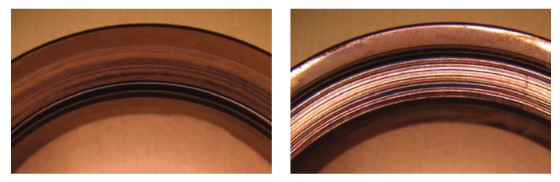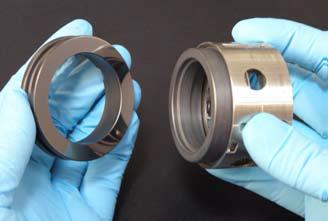 مقایسه بین سطح سیل سیلیکون کاربید بدون پوشش (سمت راست) و با پوشش UNDC پس از کارکرد در آب که هیچگونه سایشی در سطح آن مشاهده نمیشود.